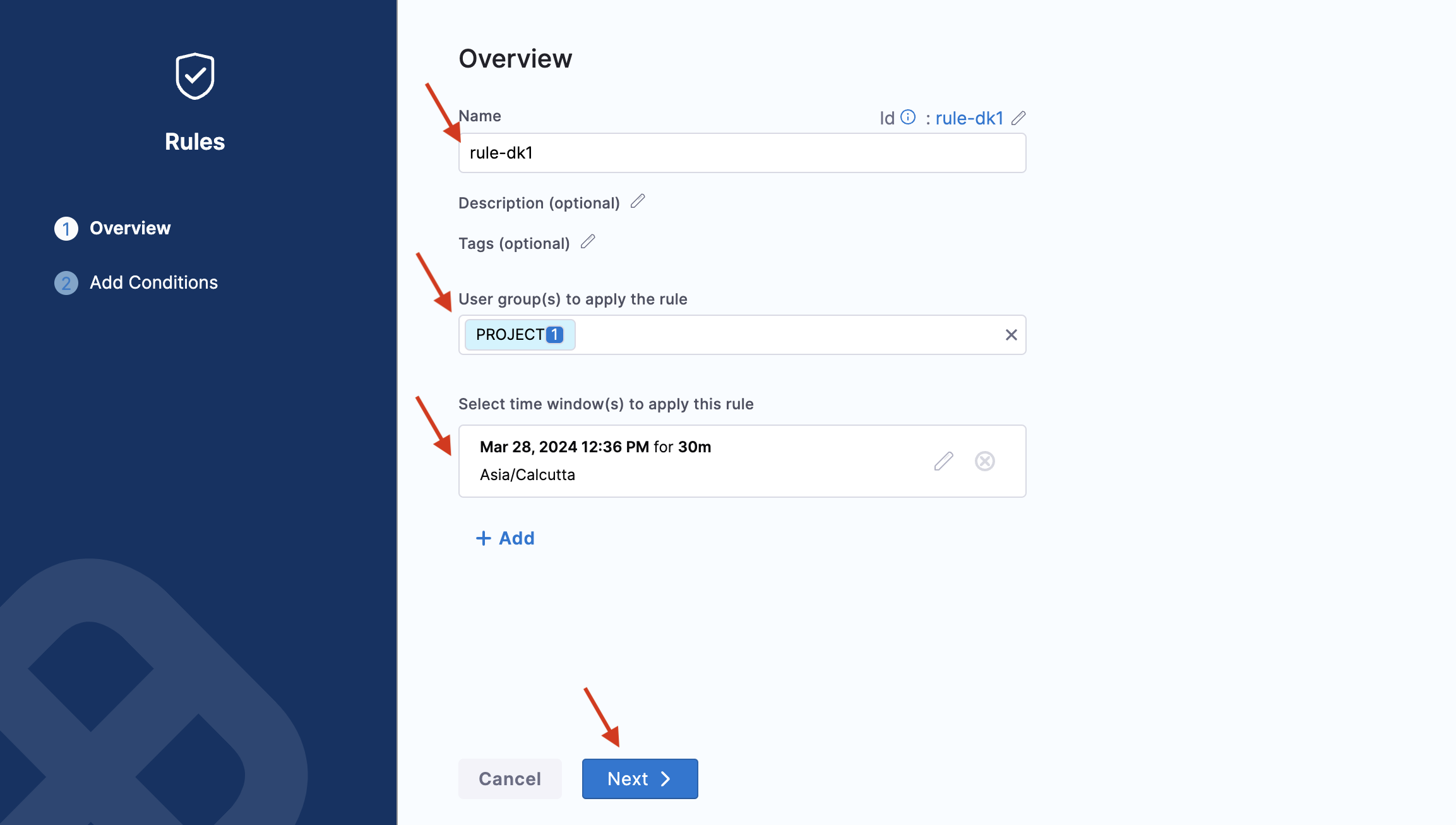 2. Specify parameters such as name, description (optional), tags (optional), user group to apply the rule (you can apply the rule to multiple user groups), and time window to apply the rule. You can apply multiple time windows to apply the rule. Click Next.