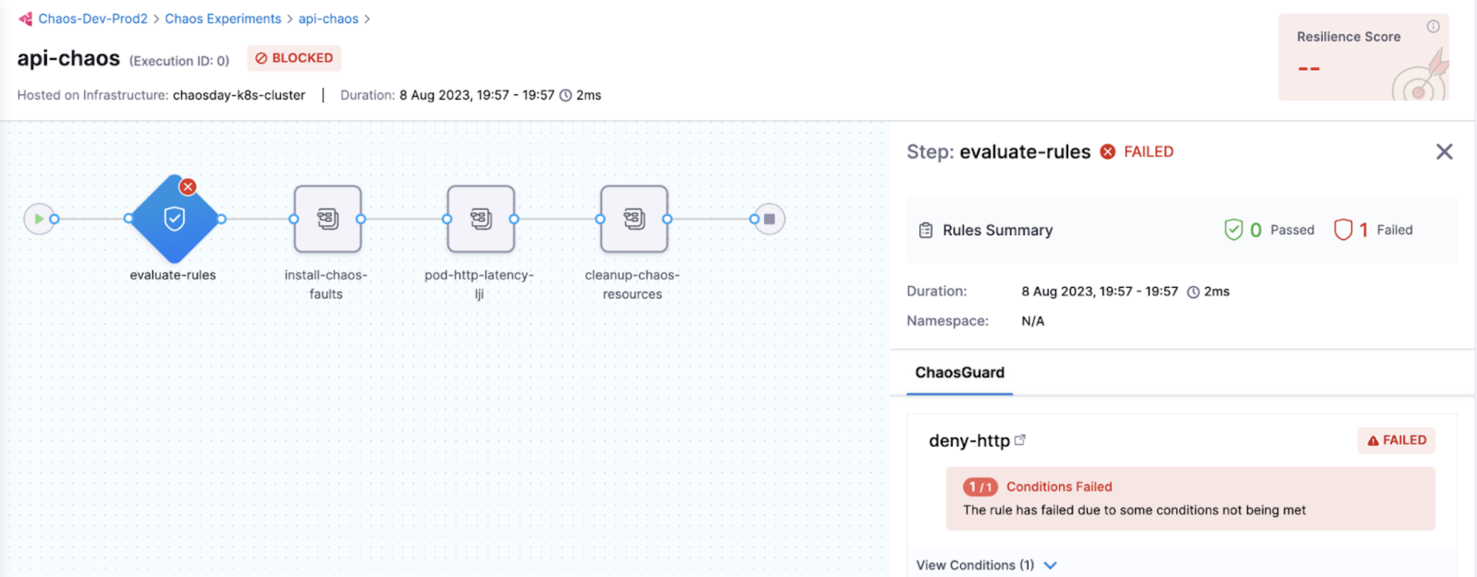 • Below is a snap that shows a failed evaluation of some (or all) rules in a chaos experiment.