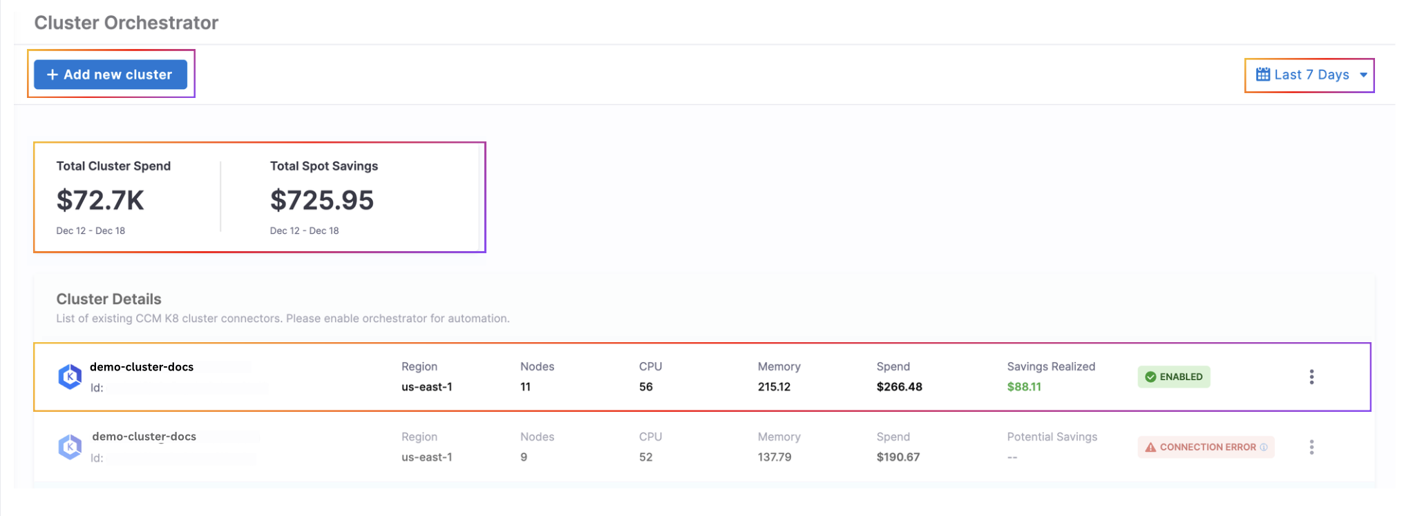 The Cluster Orchestrator homepage provides a comprehensive dashboard of your Kubernetes infrastructure costs, savings, and cluster status. This centralized view helps you monitor the financial impact and operational status of your optimization efforts across all managed clusters.