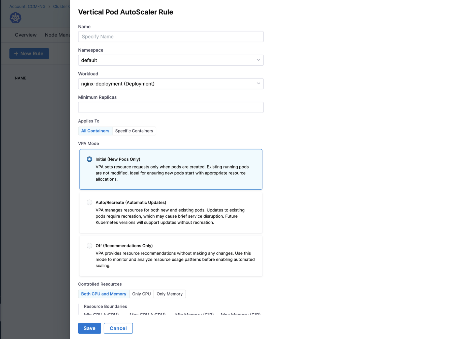 - Initial (New Pods Only): VPA sets resource requests only when pods are created. Existing running pods are not modified. Ideal for ensuring new pods start with appropriate resource allocations.