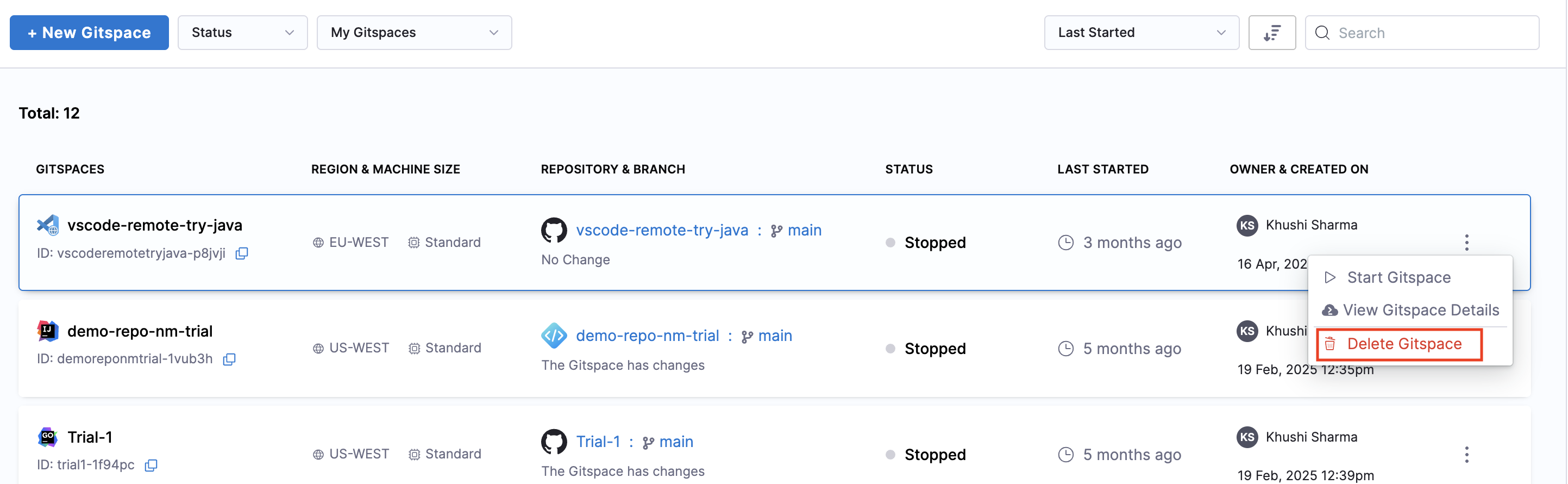 Deleting a Gitspace is an irreversible action since deleted Gitspace cannot be restored. Make sure you are sure of this action.