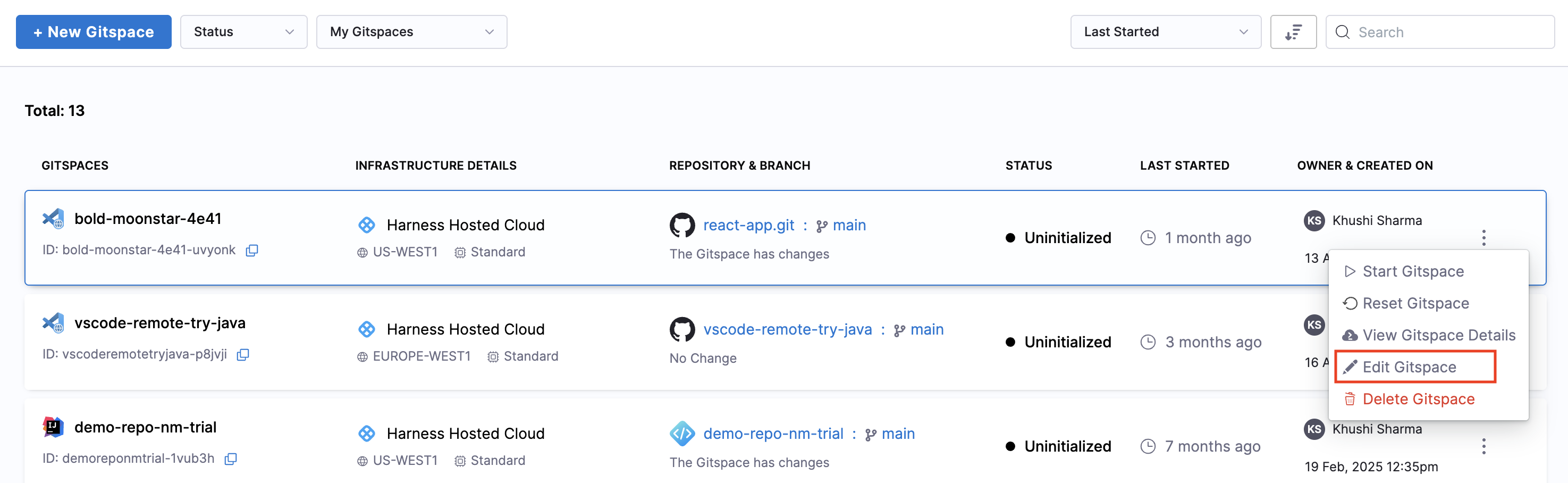 • Gitspace Dashboard: Click on the "three dots" menu of your Gitspace and click on Edit Gitspace.