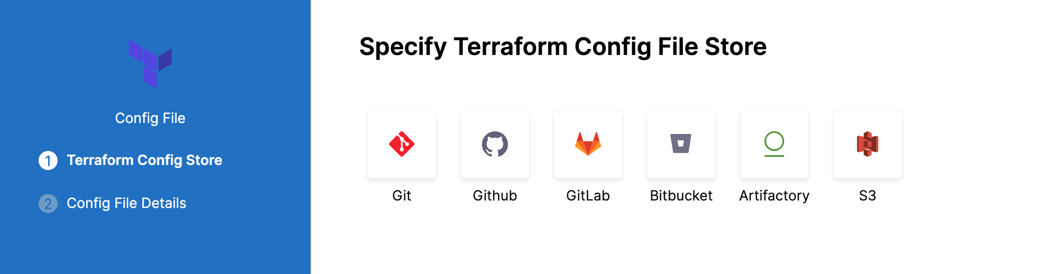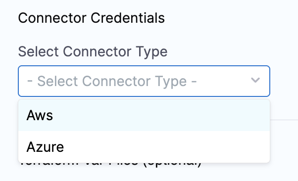 Select or create a Connector for your repo. For steps, see Connect to a Git Repo or Artifactory Connector Settings Reference (see Artifactory with Terraform Scripts and Variable Definitions (.tfvars) Files).