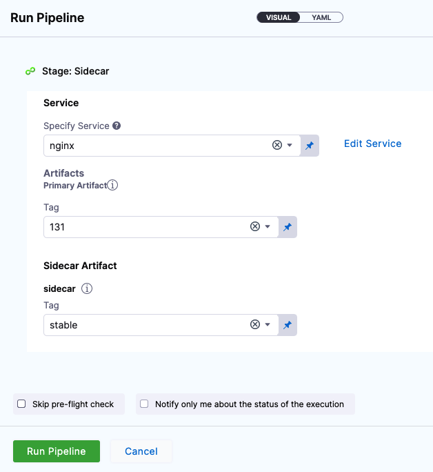 If you are using Artifacts, when you deploy a Pipeline with a sidecar Artifact, you are prompted to select the sidecar artifact tag as well as the primary artifact tag: