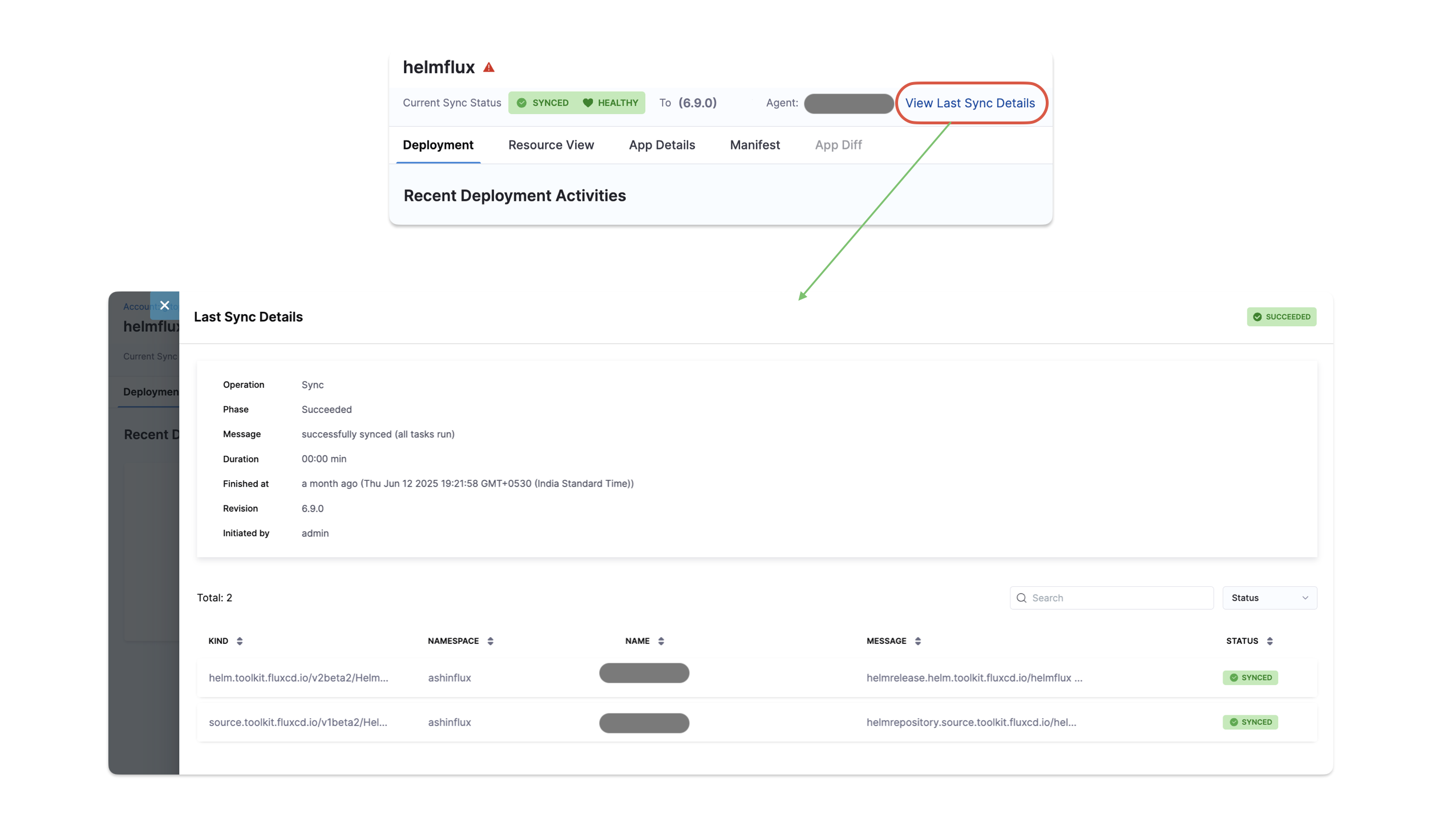 Users can now view details like sync history, commit ID, sync result, and timestamps in a side drawer that opens directly from the application dashboard.