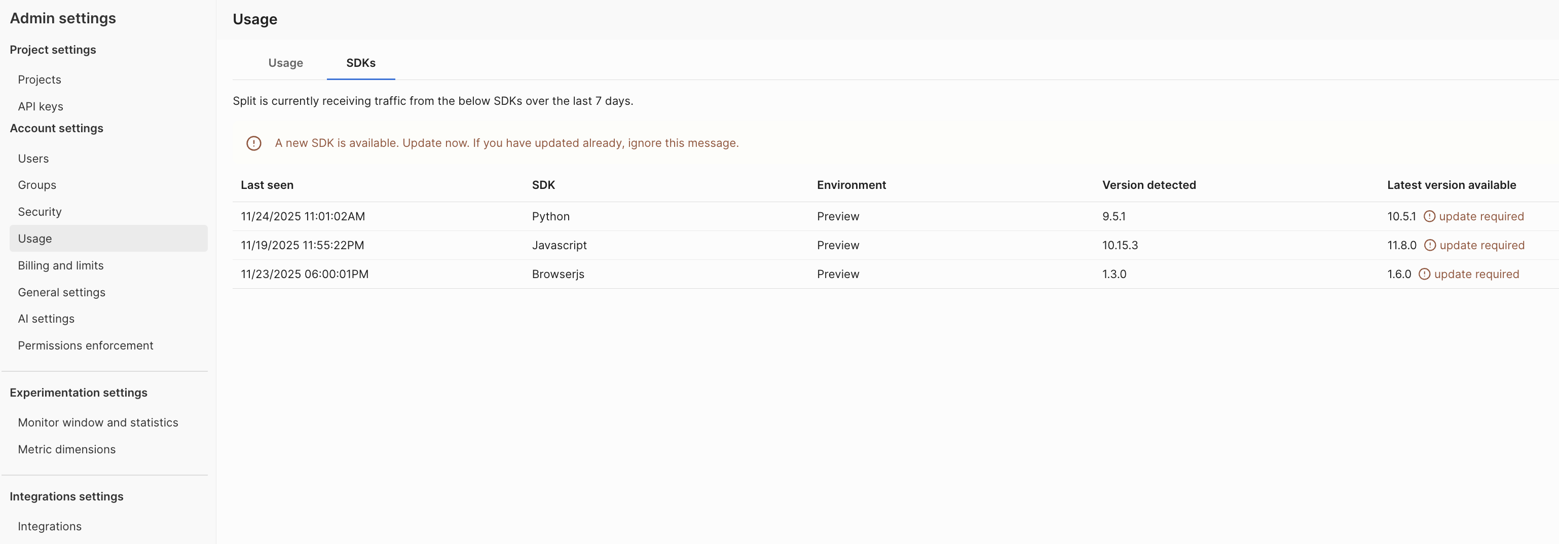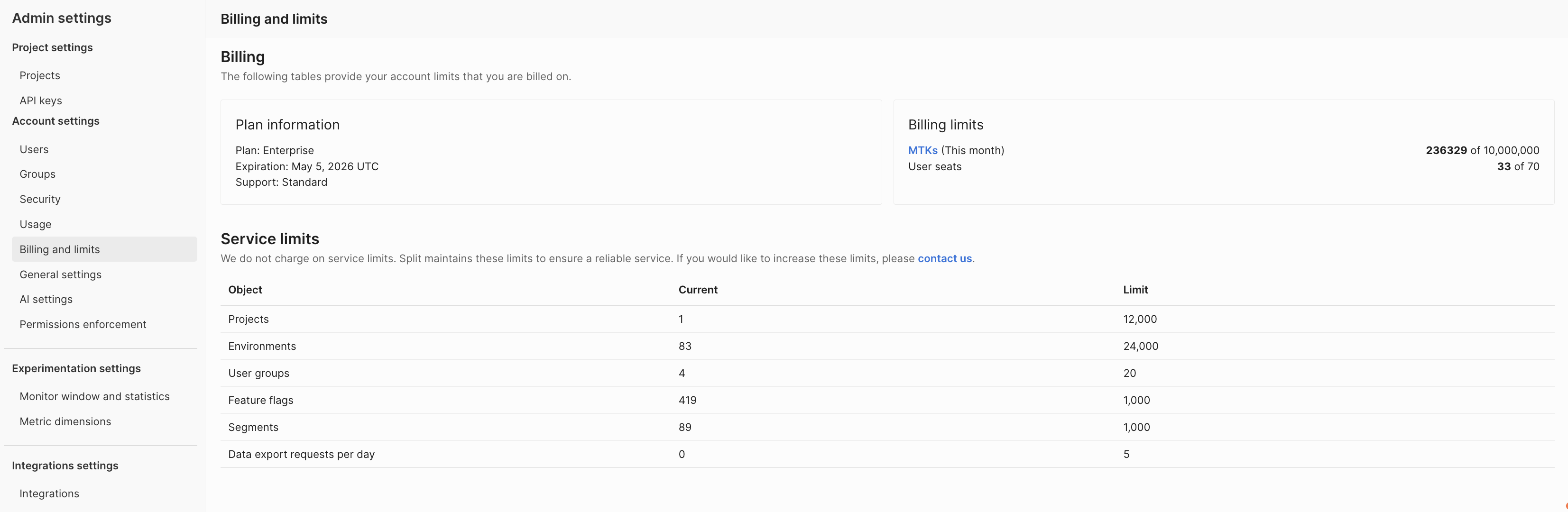 This page describes the usage reports, billing details, and service limits available in Harness Feature Management & Experimentation (FME). Navigate to the Usage and Billing and limits pages in FME Settings to access the following information: