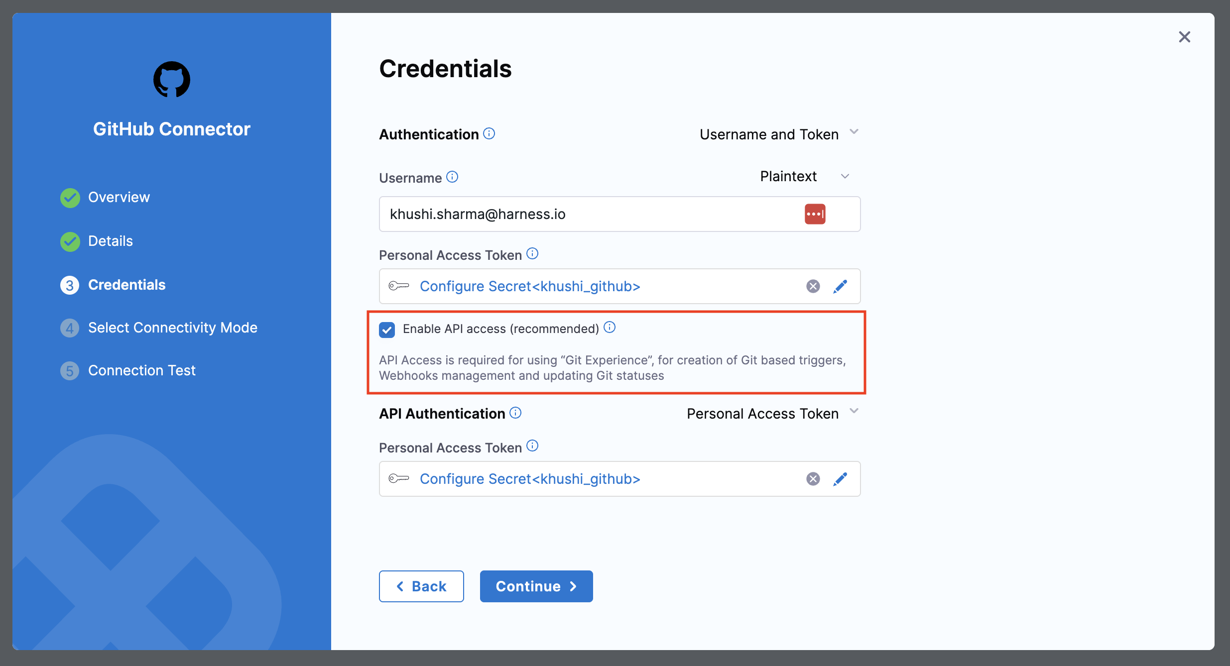 • Enable API Access: For connection types and authentication methods where API access is not already enabled by default, you'll have to enable it from the Git connector settings. API Access is required for using Harness Git Experience. Refer to these docs to enable API access.