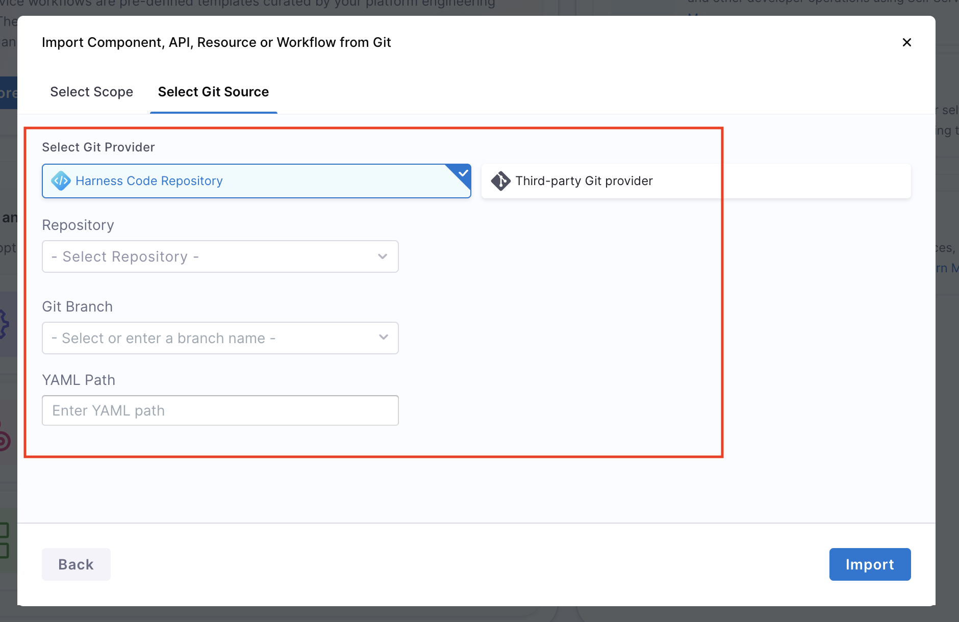 • Harness Code Repository: When importing via Harness Code, YAMLs can be sourced from any repository that the user has access to. The repo’s scope does not affect the entity scope. The following details are required in importing an entity from Git using Harness Code Repository: