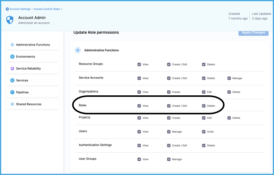 To manage roles in Harness, you need a role, such as Account Admin, that has permission to view, create/edit, and delete roles.