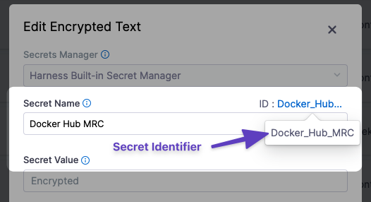 When you create a secret, Harness automatically creates an Id based on the name. You can use the identifier to reference a secret in your connectors, steps, stages, and other settings and commands that expect or ingest secrets.