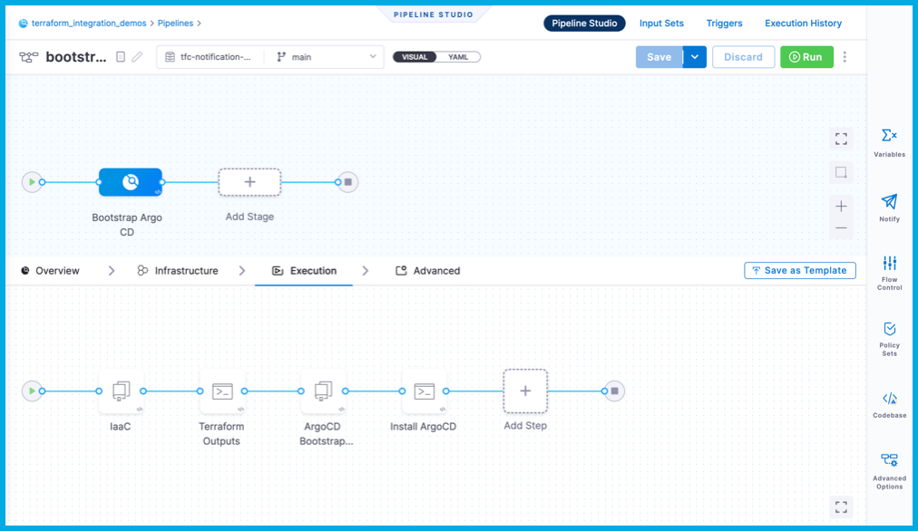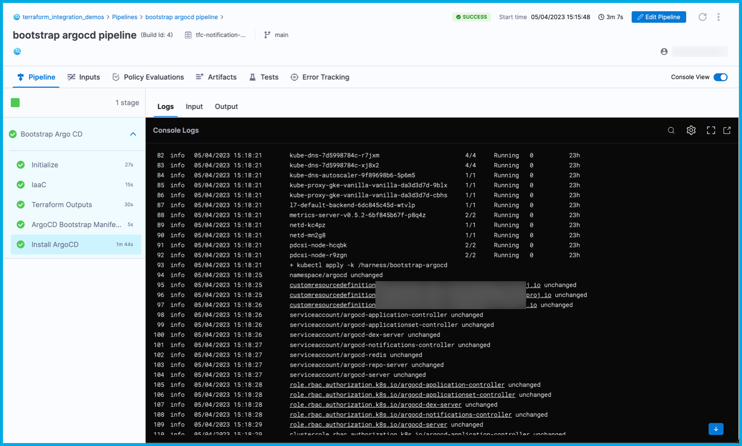 This pipeline is now configured to listen for notifications of IaC events from Terraform, and the pipeline only runs when it's necessary. Specifically in this pipeline, any changes to the $TFC_GKE_REPO trigger a plan and apply on Terraform Cloud. A completed plan triggers the bootstrap argocd pipeline to run and apply the manifests from $BOOTSTRAP_ARGOCD_REPO on the GKE cluster.