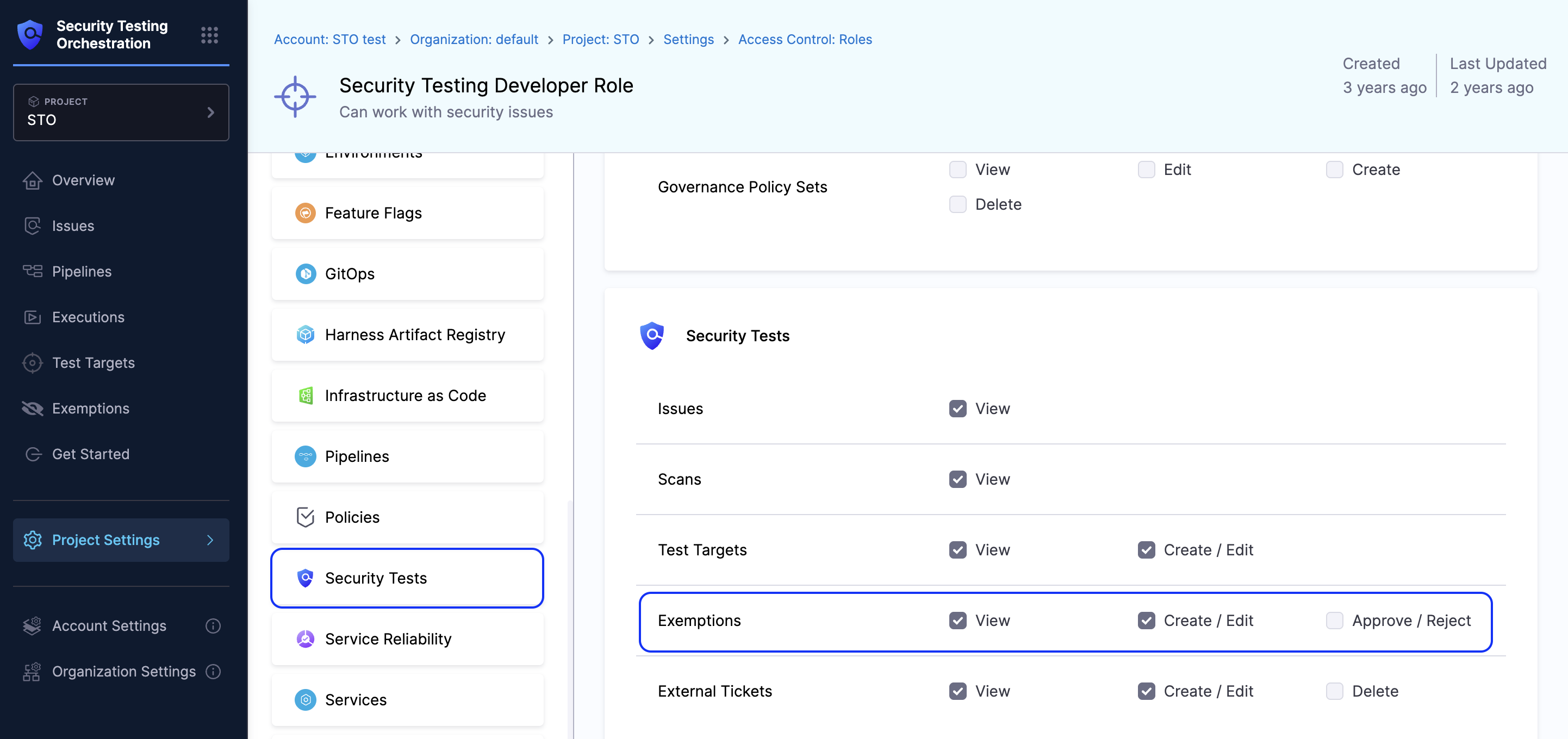 Harness provides two RBAC roles specifically for STO users. Here’s how their permissions are set up for Exemptions feature: