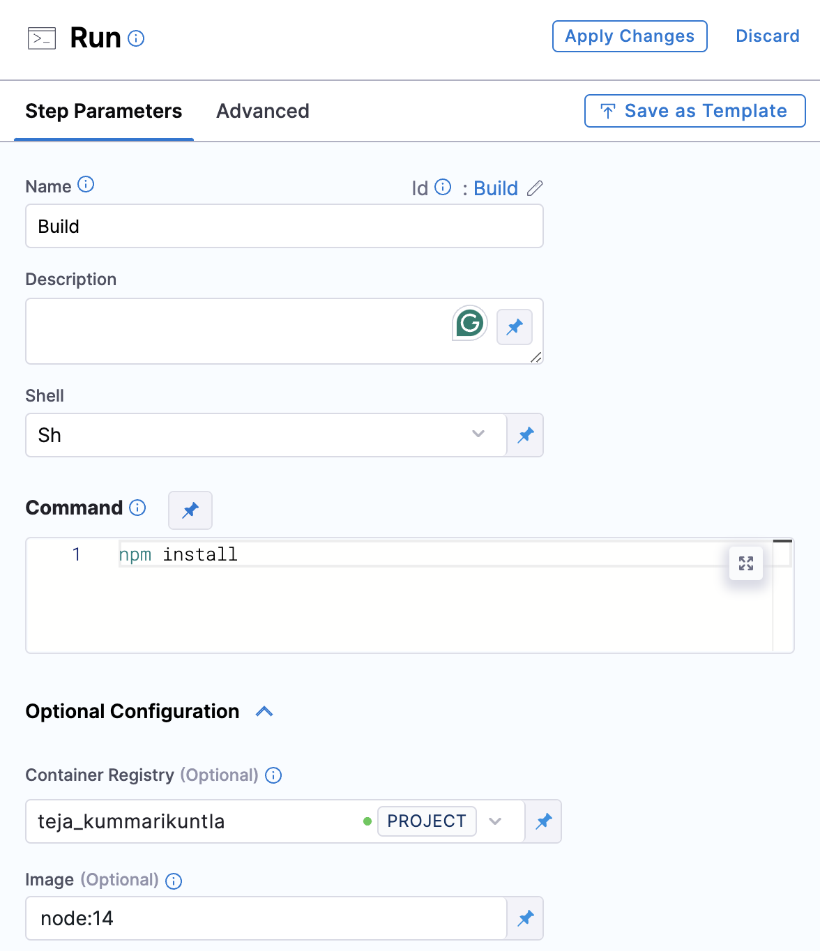 1. Add the Run step to the pipeline and open the step configuration.