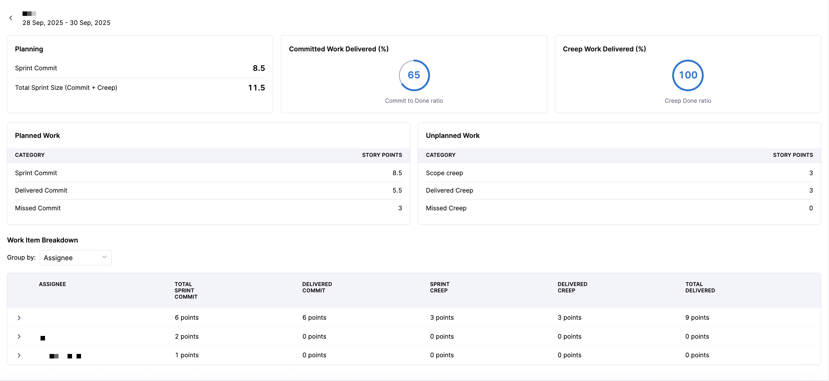When you click into a sprint, you can access sprint-specific delivery performance and work item or story point-level drilldowns, allowing you to analyze which committed items were delivered, which creep items were added and delivered, which items were missed, and how individual work items contributed to sprint outcomes.