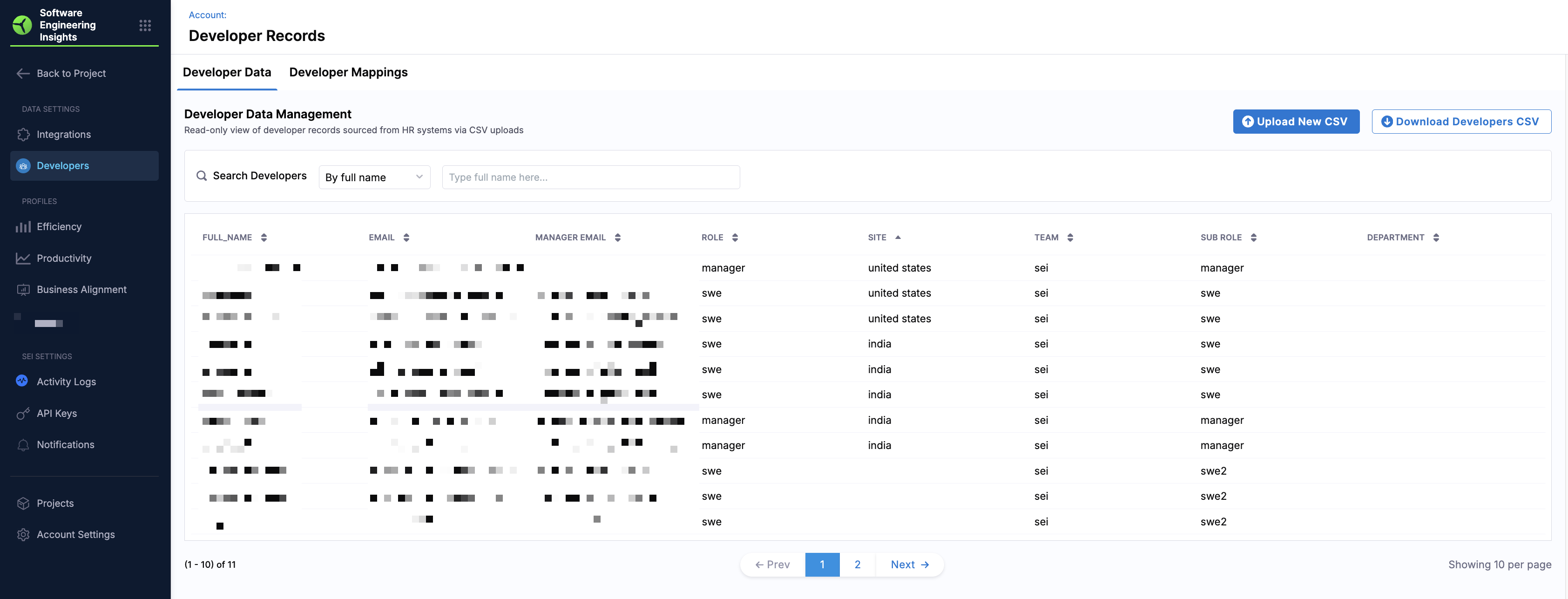 Managing developer records ensures that each individual is accurately represented, mapped to the right teams, roles, and organization hierarchies. Properly managed developer data is essential for reliable metrics across SEI dashboards.