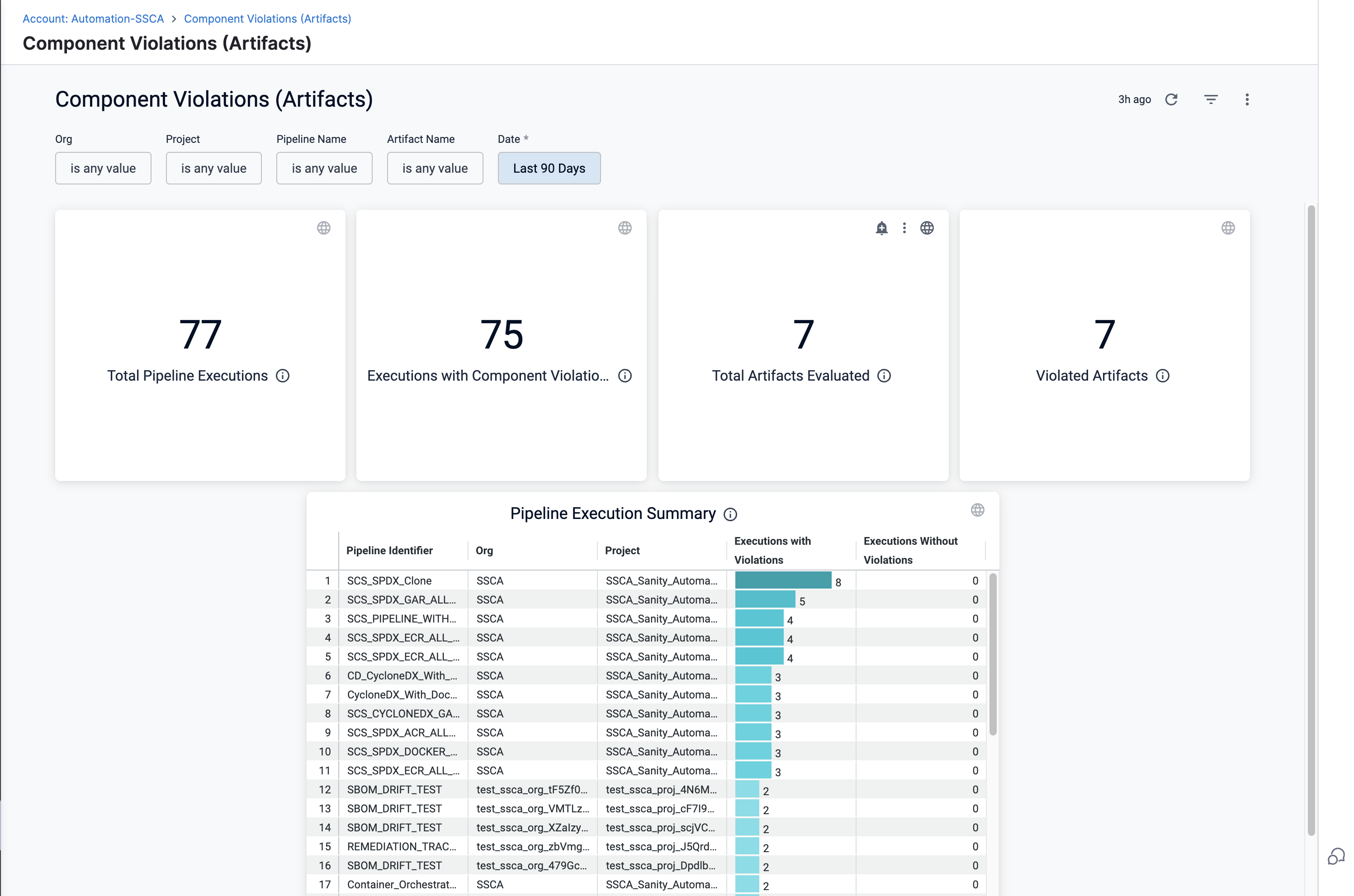 Pipeline Executions with Component Violations: Count of pipeline executions that resulted in SBOM policy violations for artifacts.