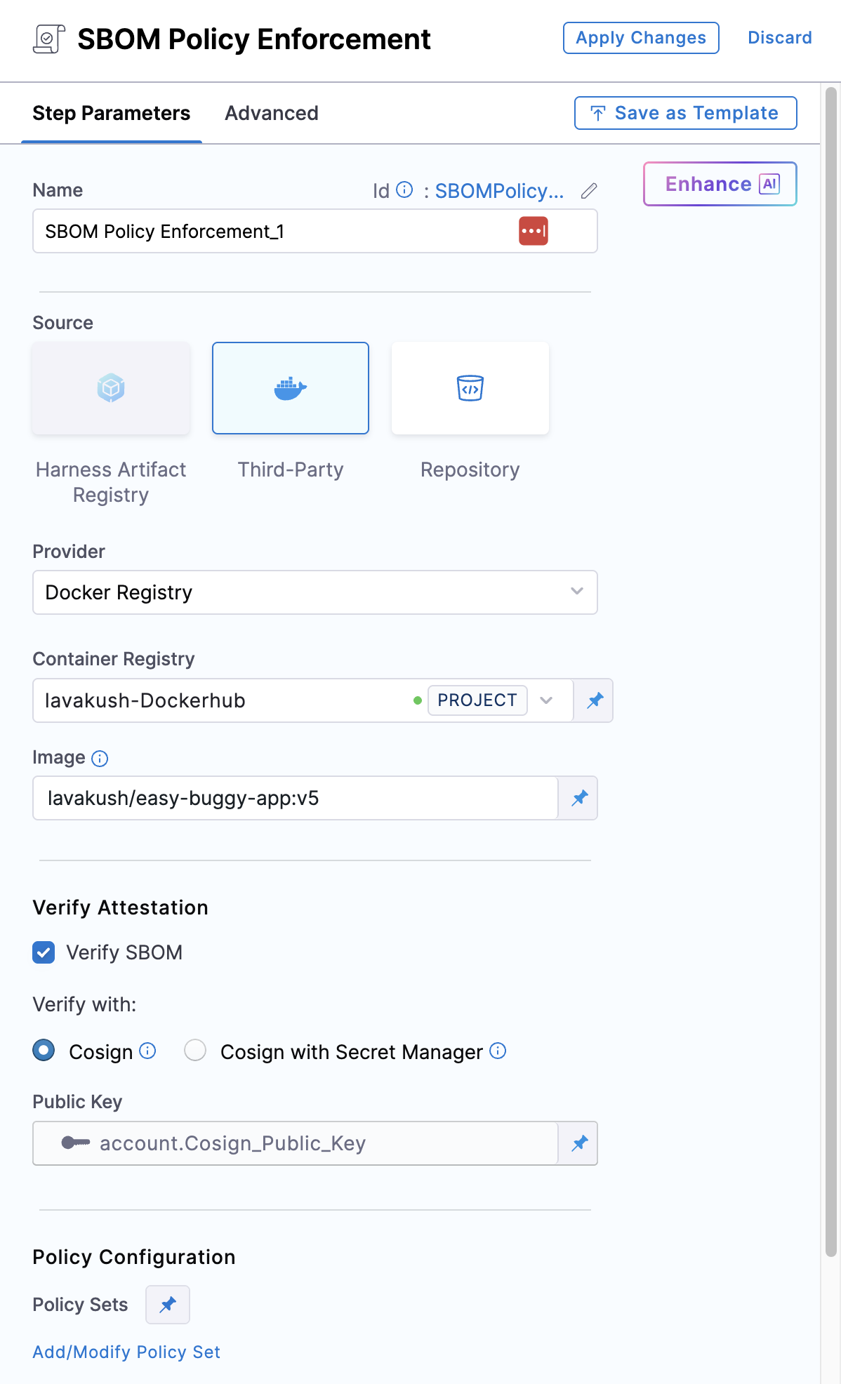 You can configure the step to enforce policies on the SBOM by selecting the appropriate policy set.