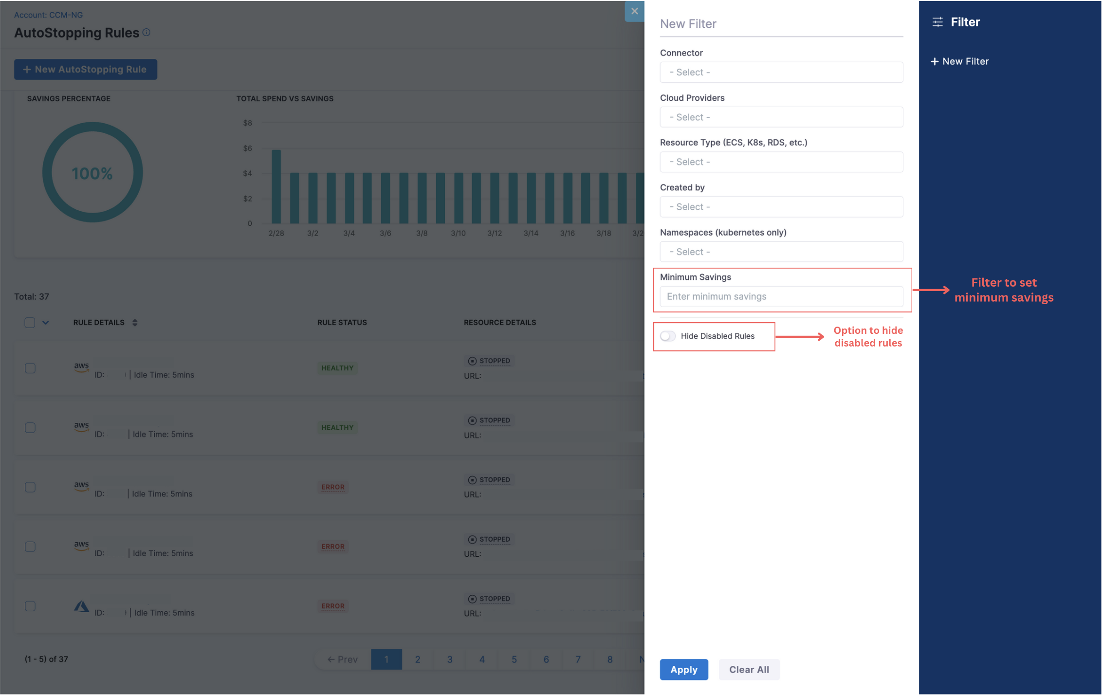 Savings will be calculated for rules that are created and resources are being utilized. Rules created with valid resources will display savings numbers as long as the resource is valid and cost data is available in the Cloud Usage Report (CUR). Resources that are onboarded in "Down" state and not used after rule creation will not show any savings, as the details of such resources will be completely missing in the CUR.