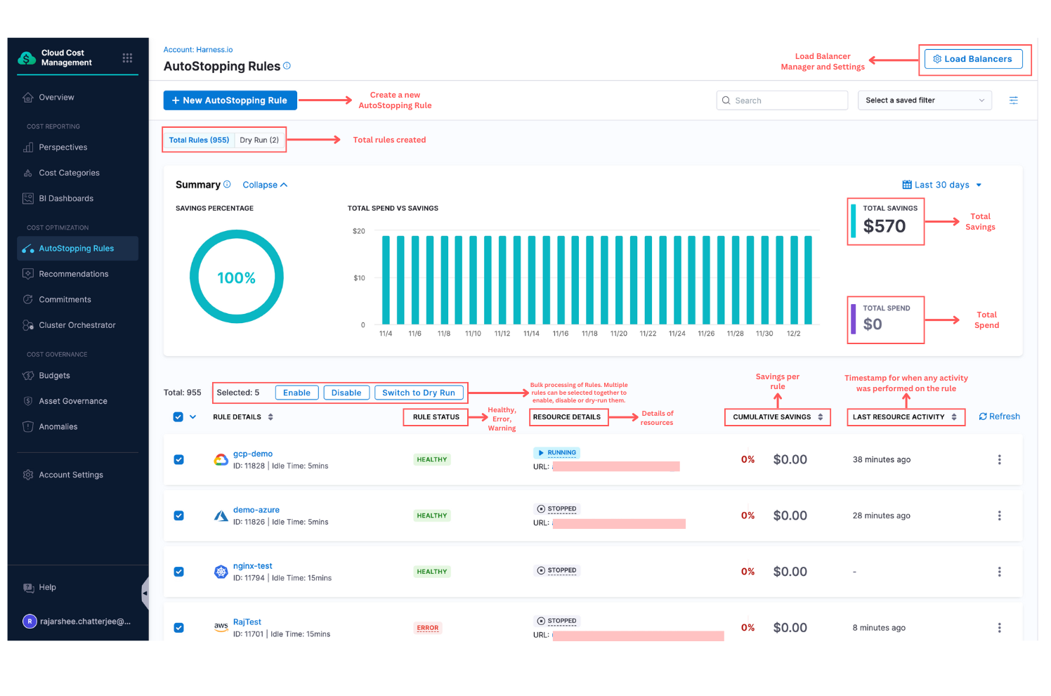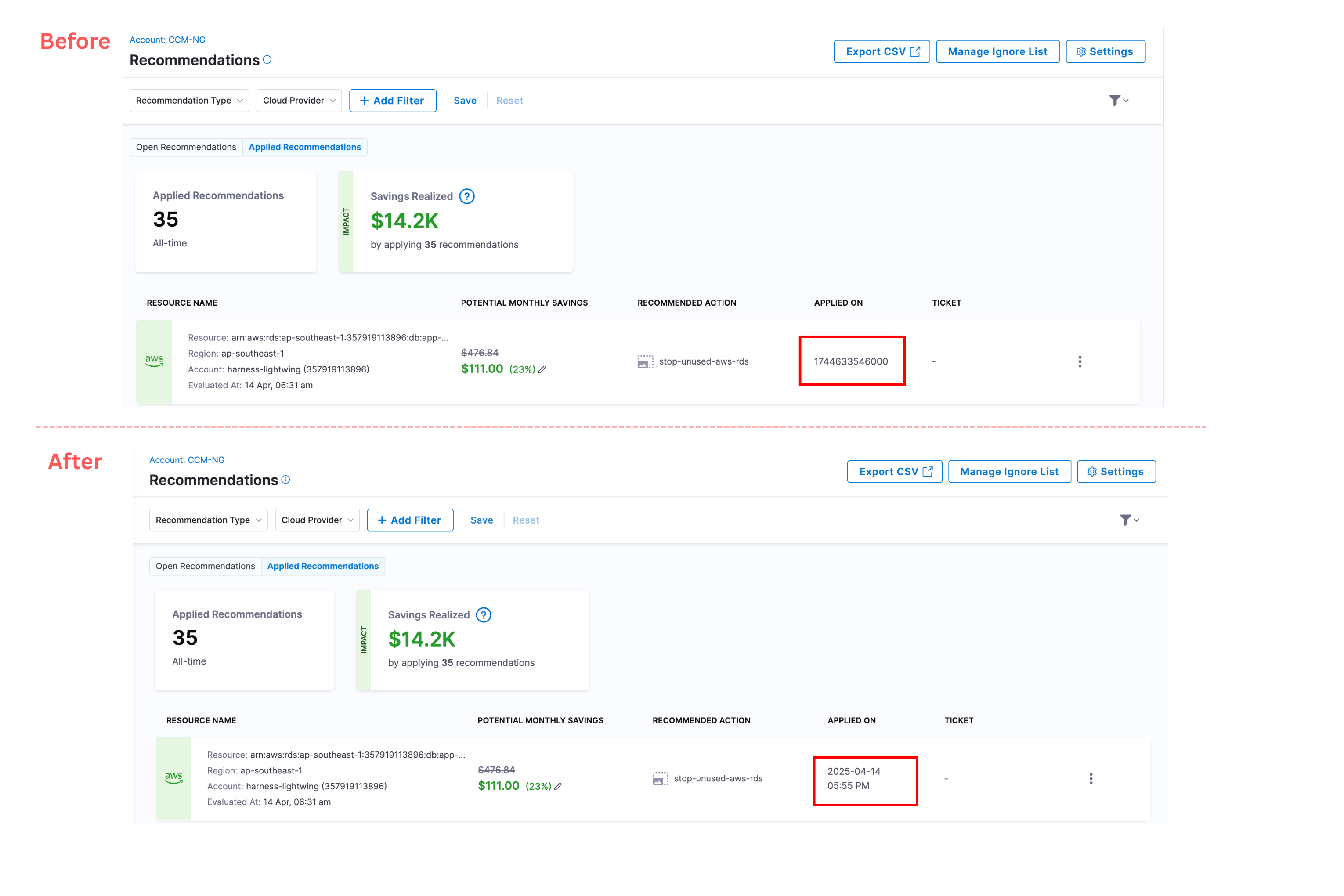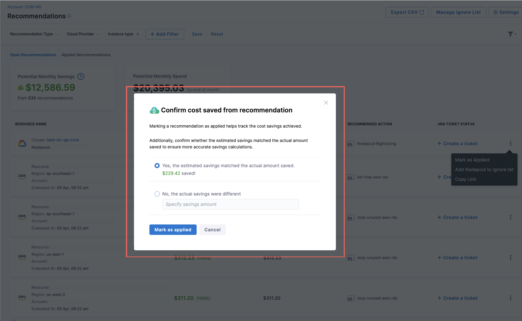 - Realized Savings from Governance Enforcements: We’ve added support for showing realized savings for enforcements. On both the enforcement list page and the enforcement details page, monthly savings will now be displayed for non–dry run enforcements. [CCM-27472]