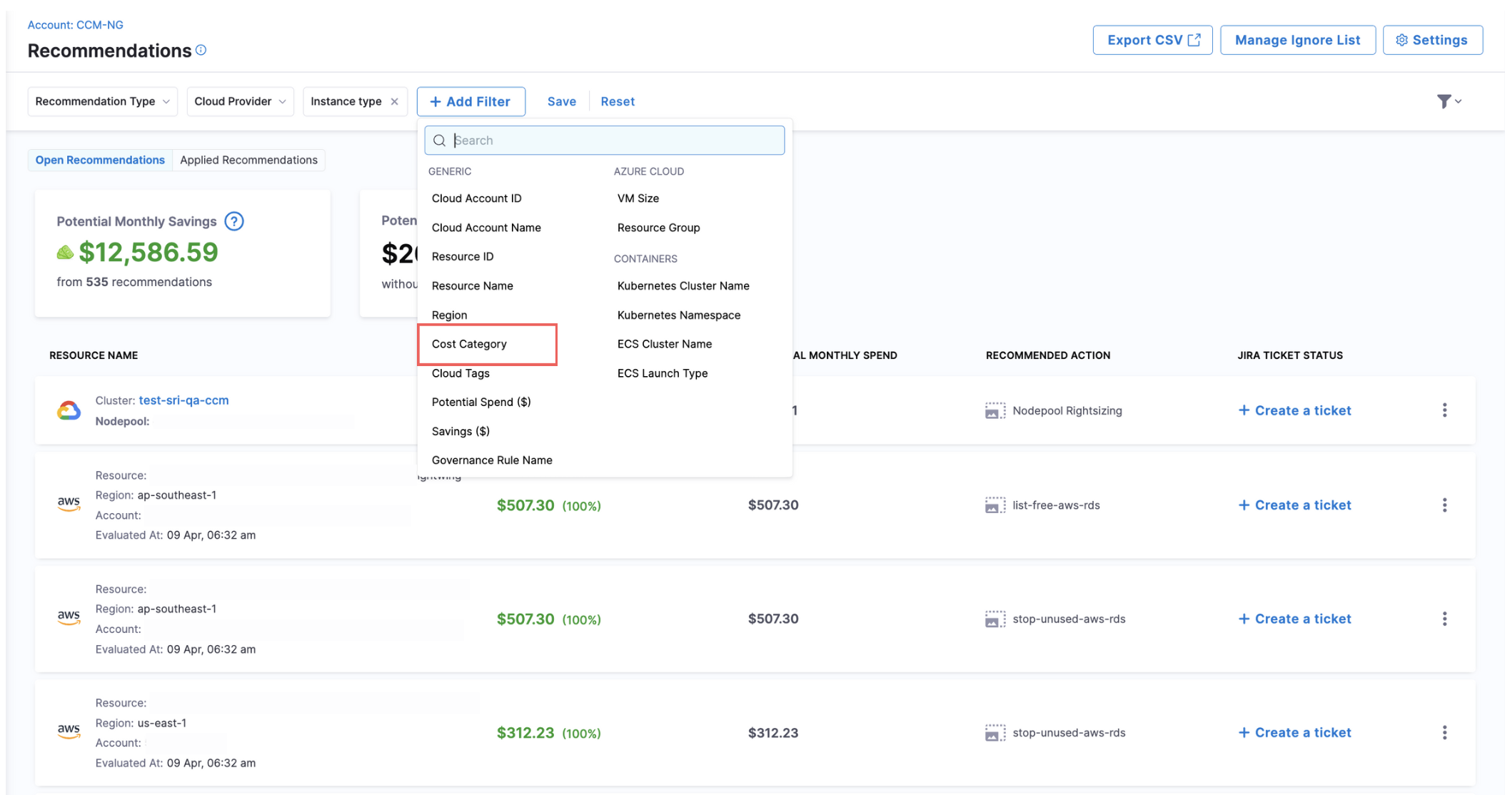 - Refresh recommendation resources and instance details (CCM-8720)