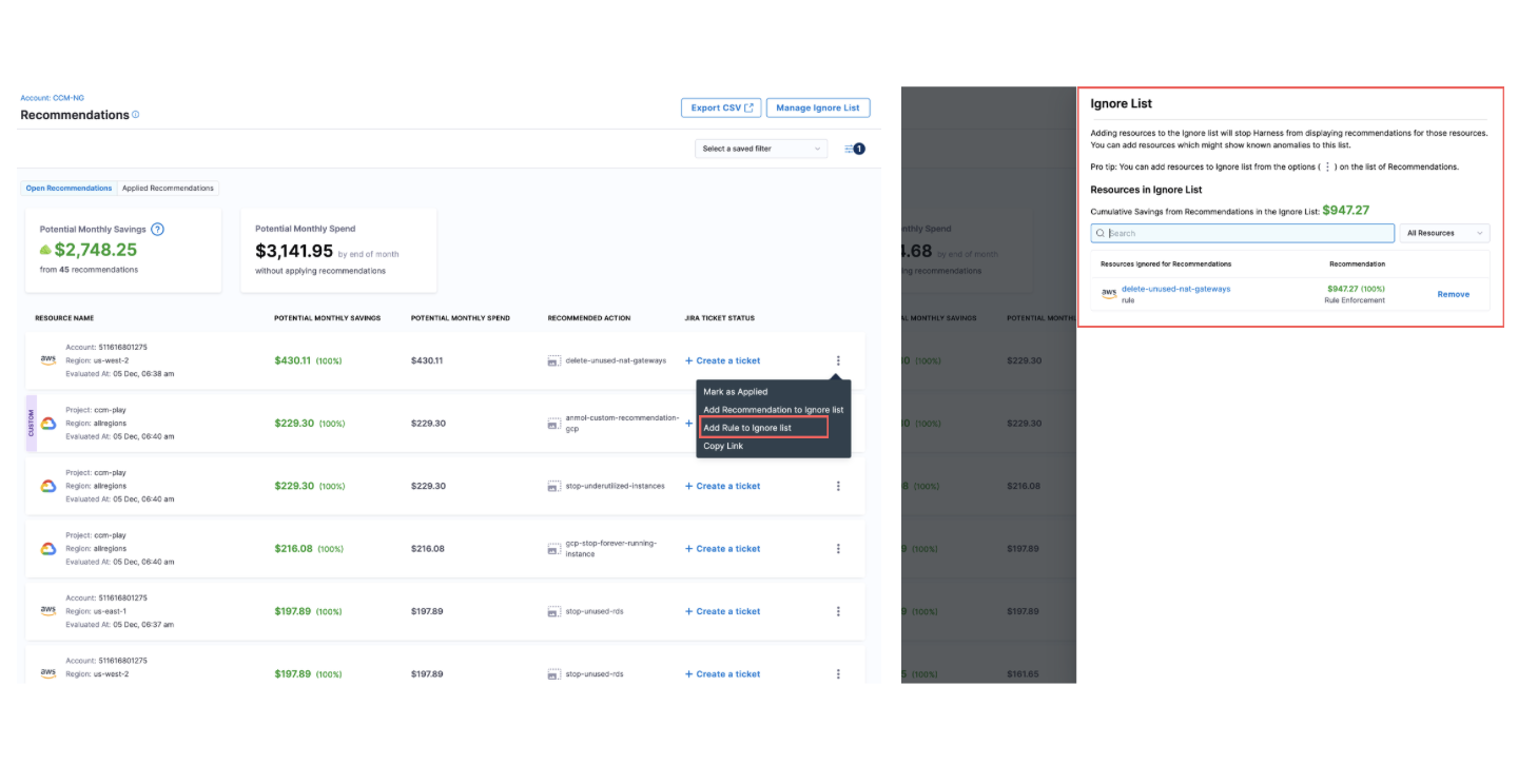 Enhanced Recommendation Management: We’ve added support for temporarily ignoring recommendations. Users can now ignore a recommendation for 7, 15, or 30 days, or ignore it permanently. Once the selected duration expires, the recommendation will automatically move back to the Open tab on the Recommendations page. [CCM-27645]