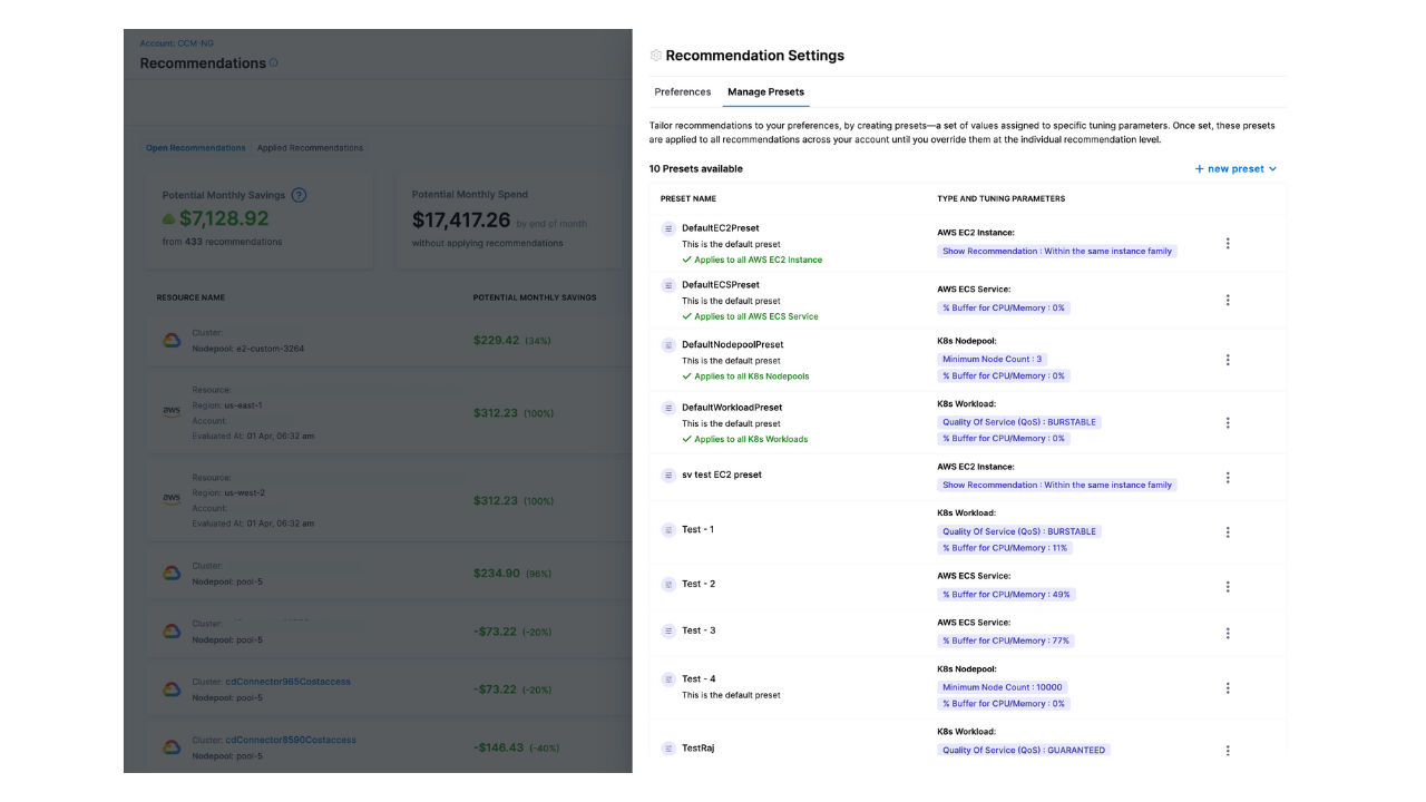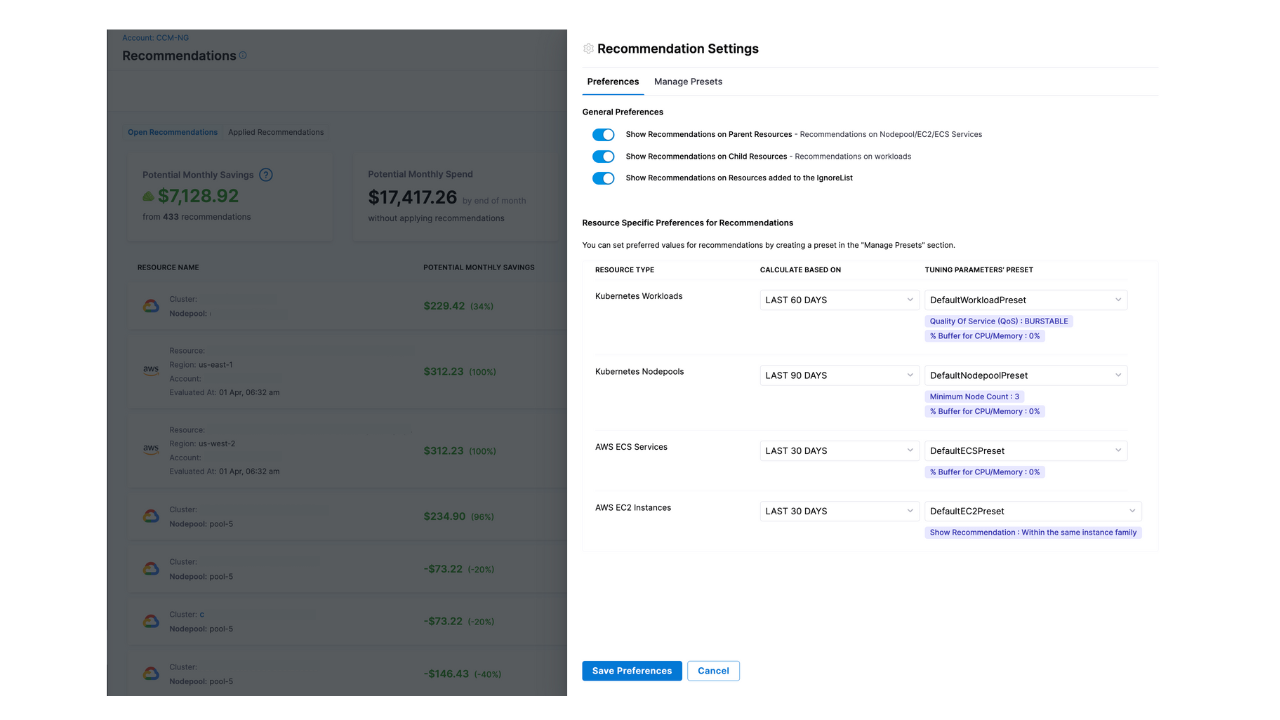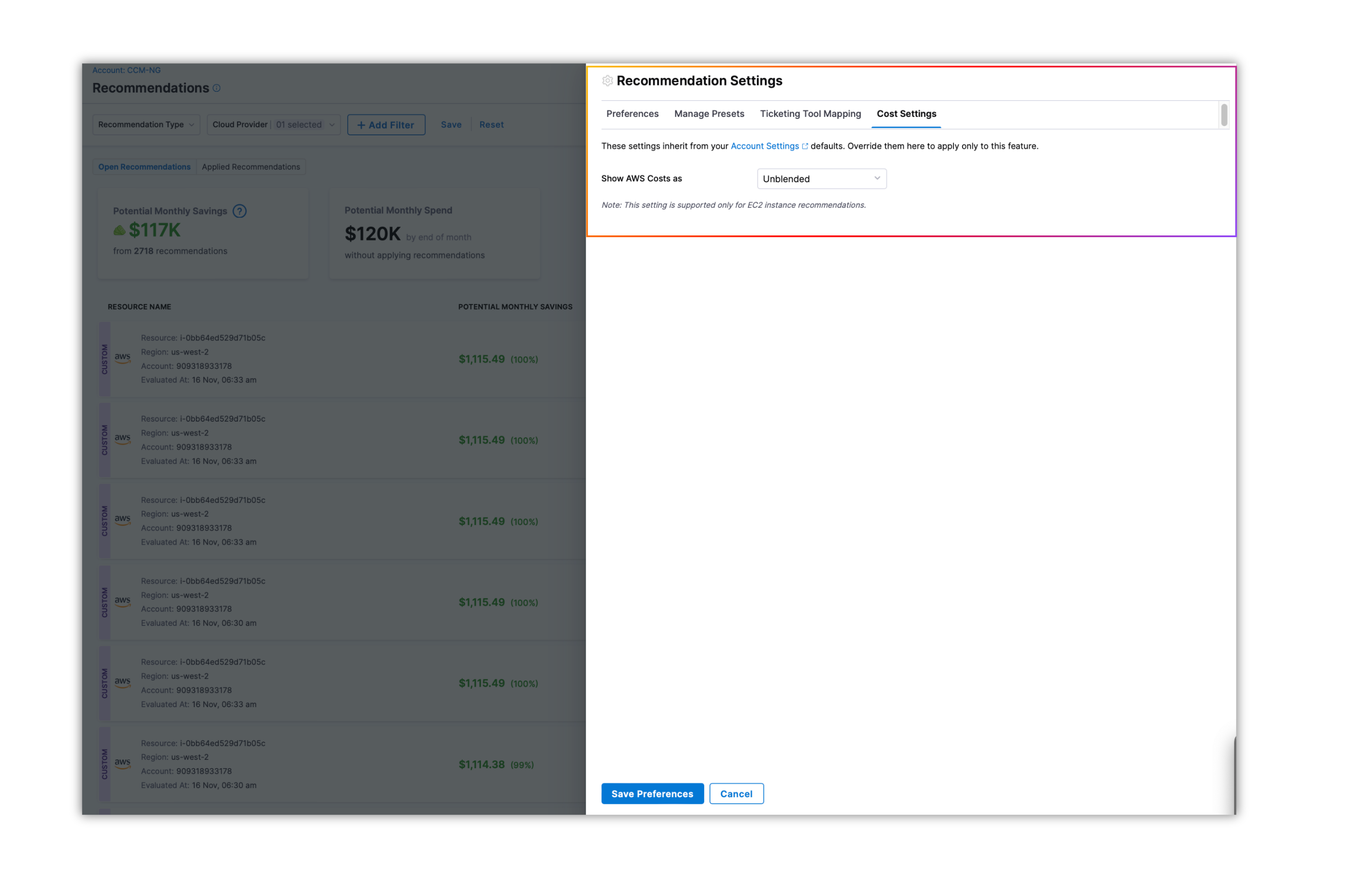 - Recommendations Cost Settings: We have added support for configuring AWS cost type settings (Net Amortized or Unblended) for EC2 recommendations. These settings inherit from your Account Settings defaults but can be overridden specifically for this feature. This feature is currently behind a Feature Flag. Please contact Harness support to enable it for your account. [CCM-27040]