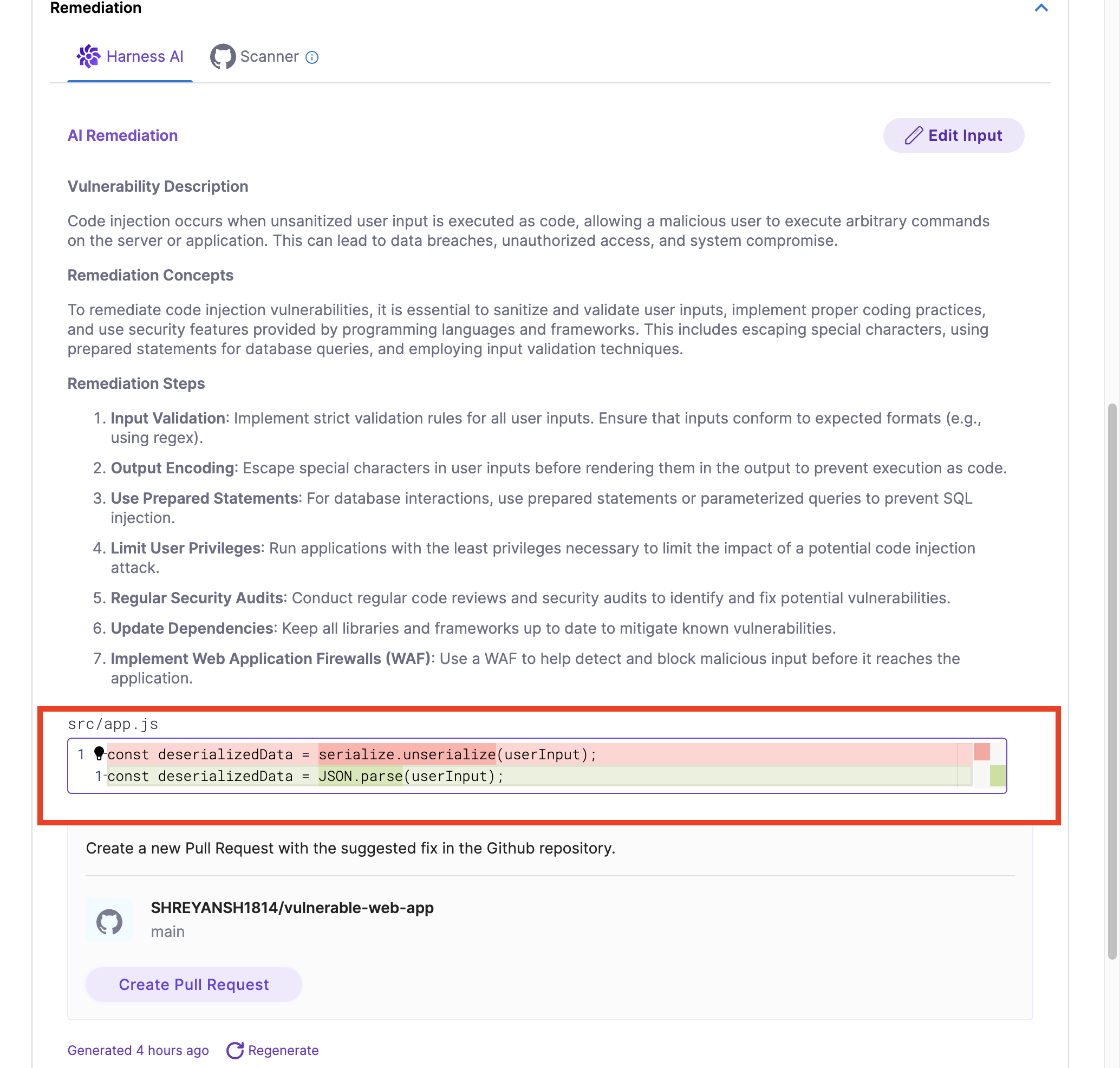 - Added support to display the suggested code diff snippet for the GitHub Advanced Security (GHAS) vulnerability findings. (STO-10151).