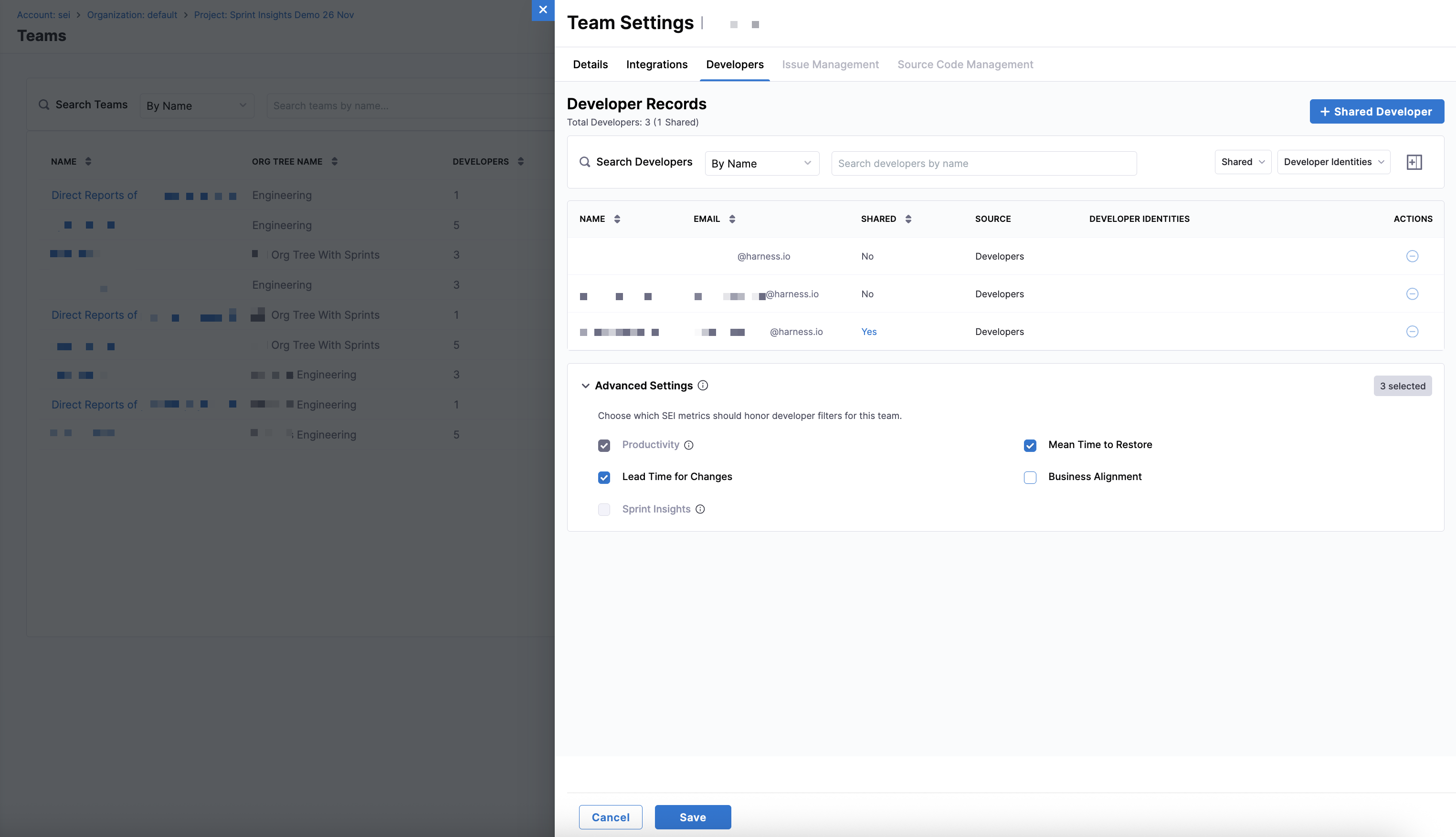 You can add shared developers on the Developers tab in Team Settings, and include contributors such as engineering managers or individual contributors who regularly work across teams without modifying Org Tree membership. This streamlines team setup, improves identity management, and ensures accurate attribution for efficiency and productivity metrics.