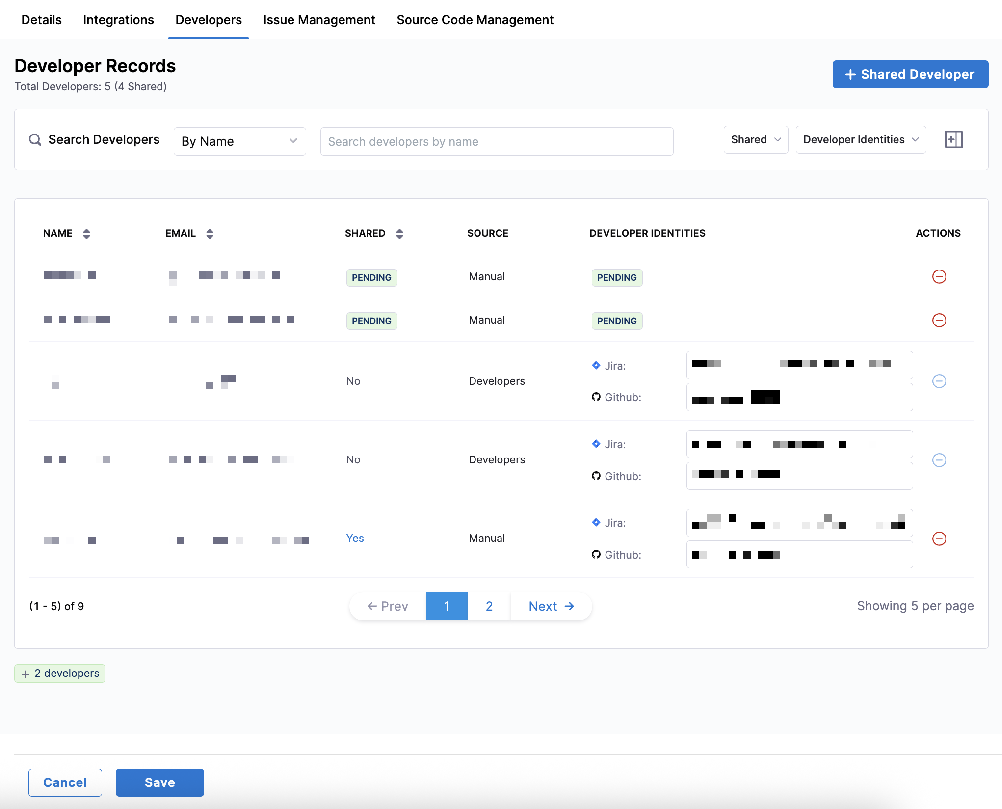 You can search for developers by name or email, filter the list by the Shared status or developers that have Developer Identities or are missing them, and include additional data columns such as Added By and Last Updated in the developer records table.